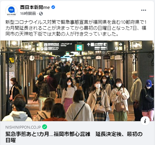 緊急事態宣言の福岡市の最初の日曜日は地下街は賑わっていたそうだ。夜を縛れば昼に出る。一方、添田町でも出たとの噂で自粛モードだが博多がこうではね~ https://pic.twitter.com/IV8VNHpxo8